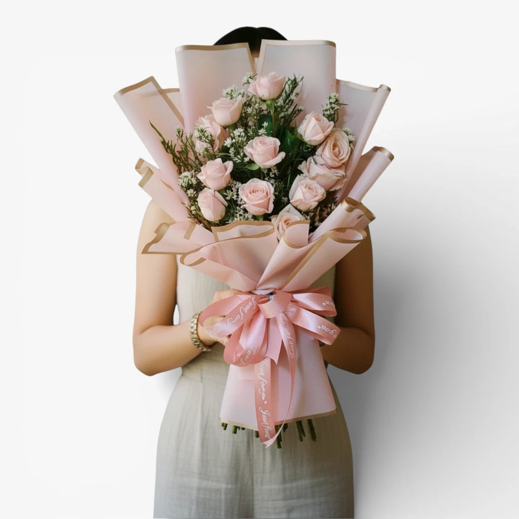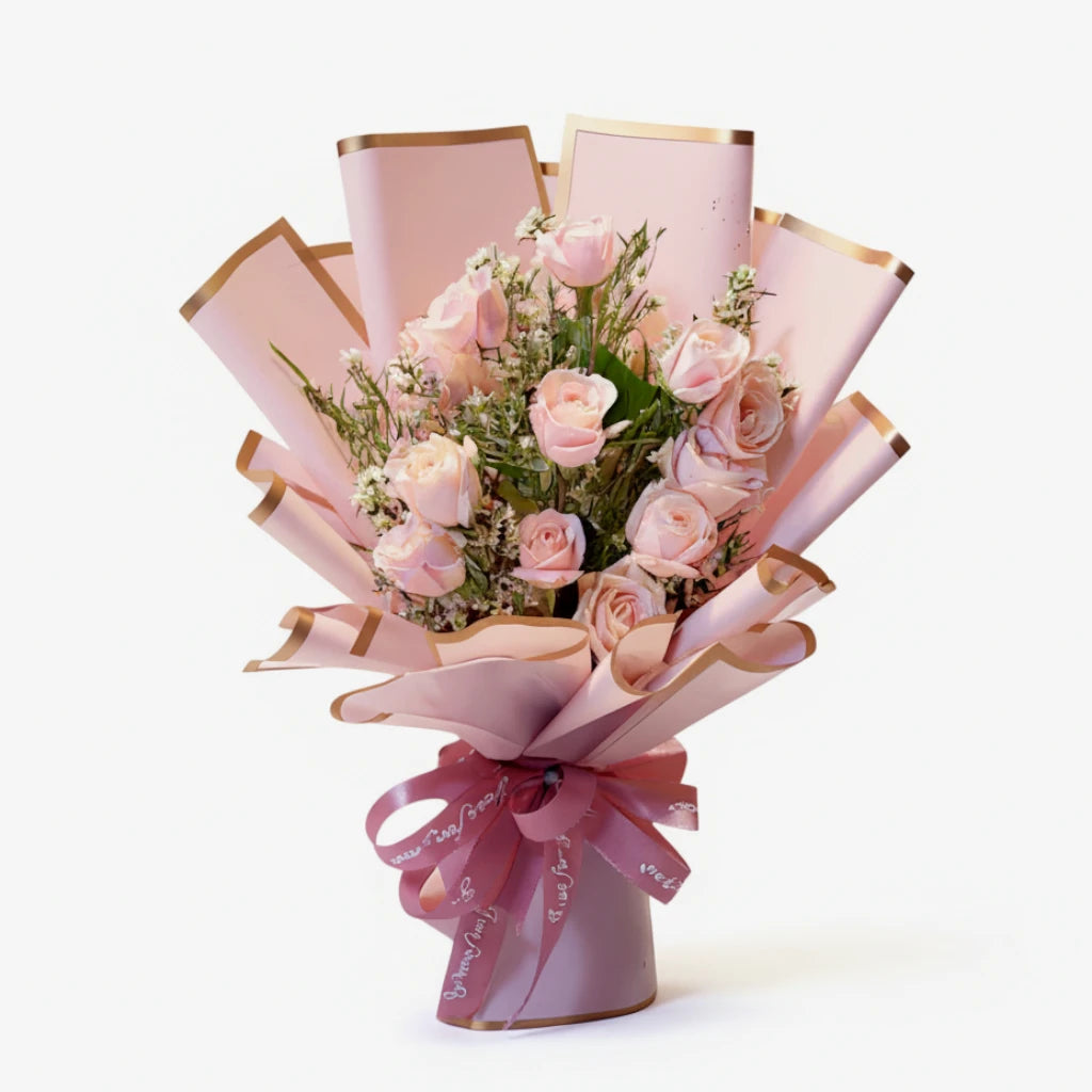 Thoughtfully curated with twelve soft pink roses and delicate white accents, this arrangement captures warmth and affection in every bloom. Whether marking a special milestone or expressing quiet appreciation, it's a timeless choice that speaks volumes without saying a word.