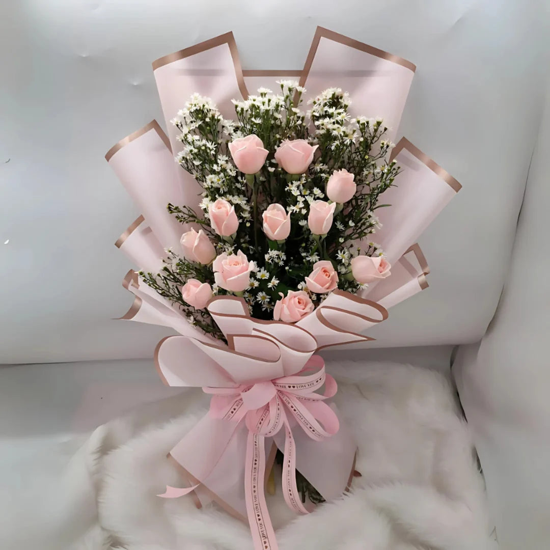 Our bouquet includes twelve fresh pink roses, symbolizing the deepest love and heartfelt gratitude. Perfect for any occasion, this arrangement reflects elegance and sentiment.