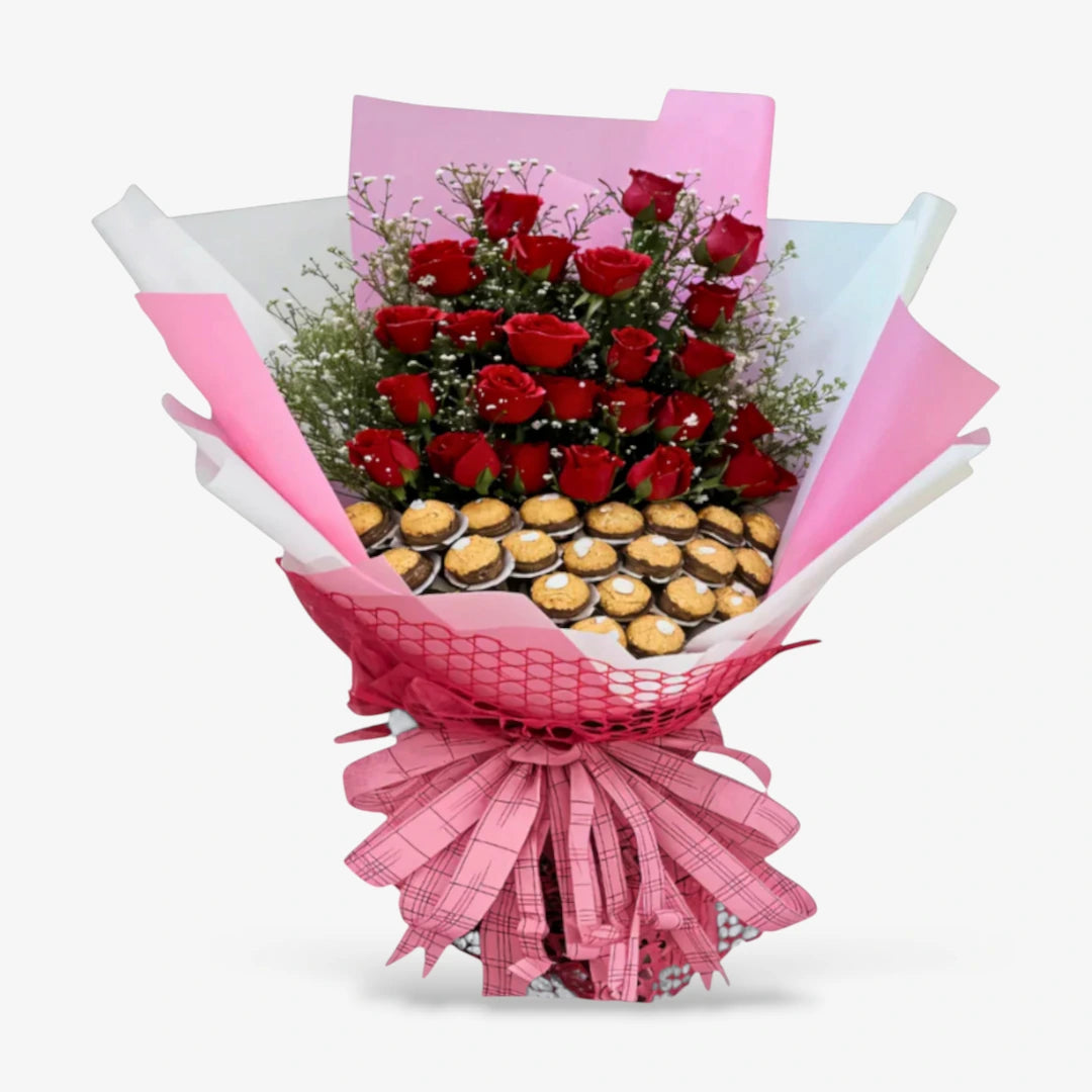 A luxurious pairing of 24 fresh red roses and 24 Ferrero Rocher chocolates—beautifully arranged to create the perfect romantic surprise. Ideal for anniversaries, sweet gestures, or special celebrations.