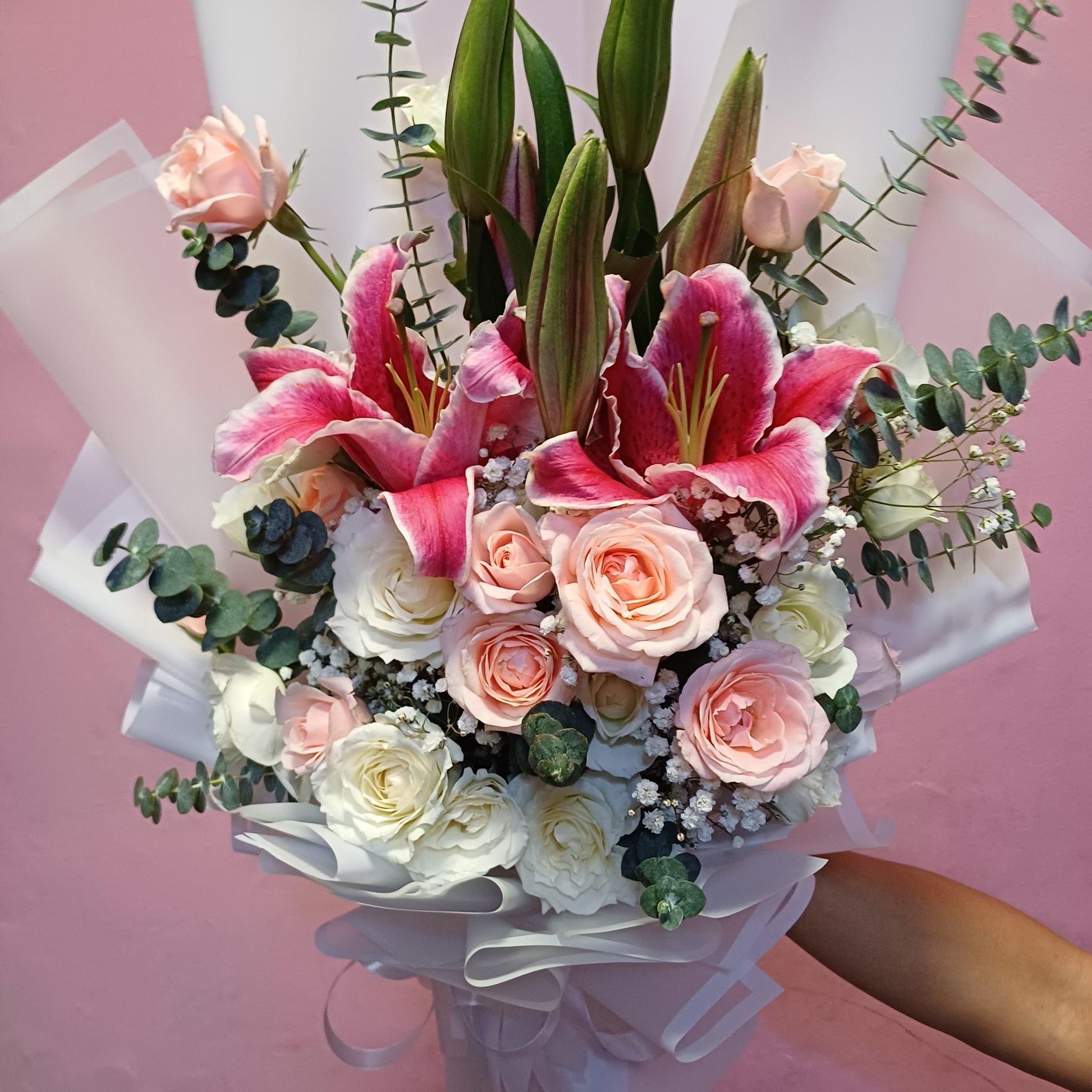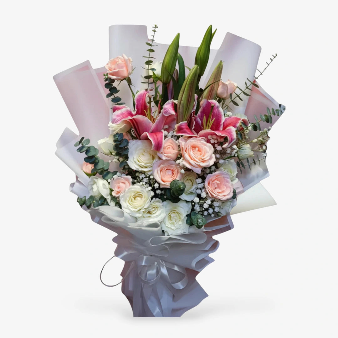 Caitlyn is a graceful bouquet of 24 white and pink roses, fragrant Stargazer lilies, eucalyptus, and gypsophila. It offers a simple yet elegant way to express your feelings with style.