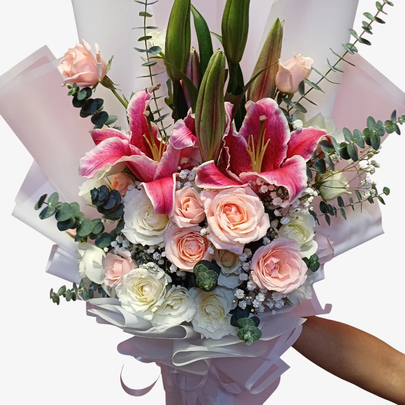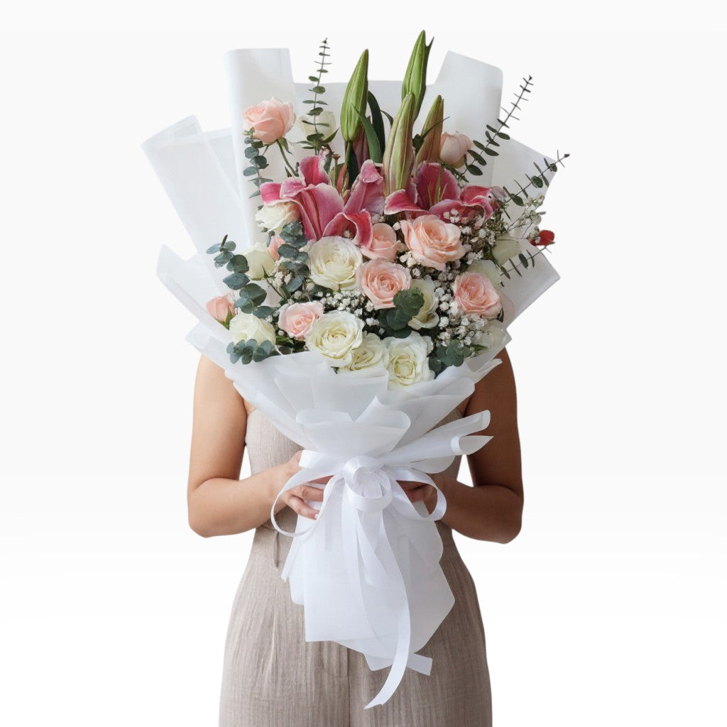 The Caitlyn bouquet features 24 fresh roses in white and pink paired with stunning Stargazer lilies, eucalyptus, and gypsophila, creating a sophisticated presentation that expresses your feelings with style.