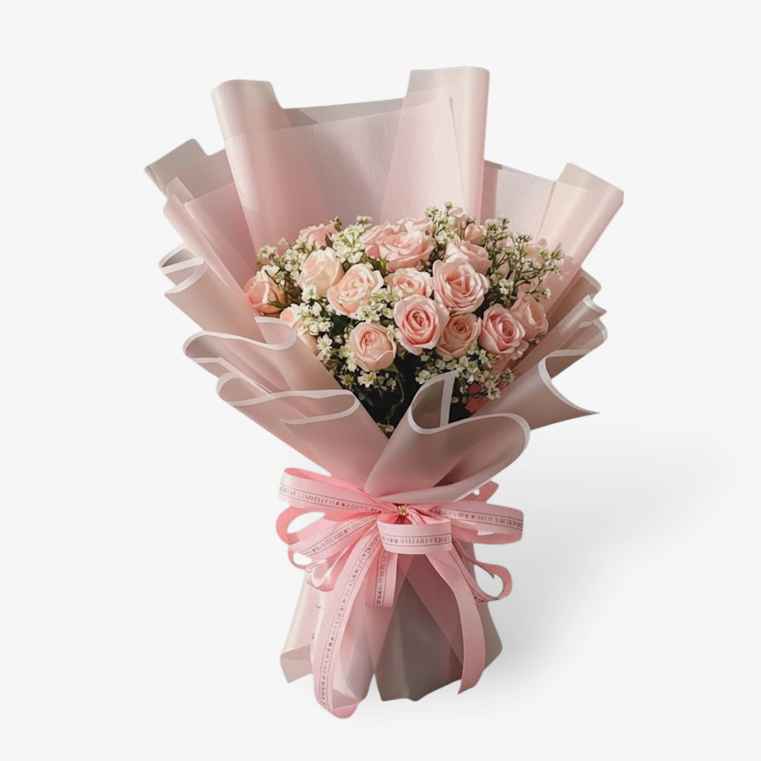 Express your admiration in the softest, most elegant way with this stunning arrangement of 24 fresh pink roses and delicate baby's breath, beautifully wrapped in romantic, refined pink paper.