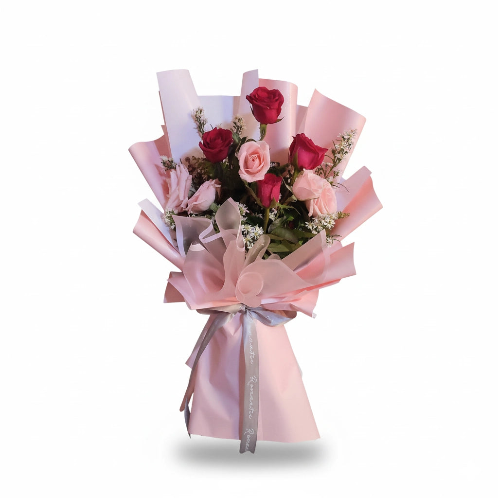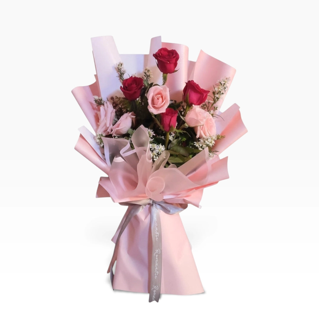 Featuring a stunning combination of red and pink roses, this bouquet captures the essence of happiness and love. Perfect for any festive mood.
