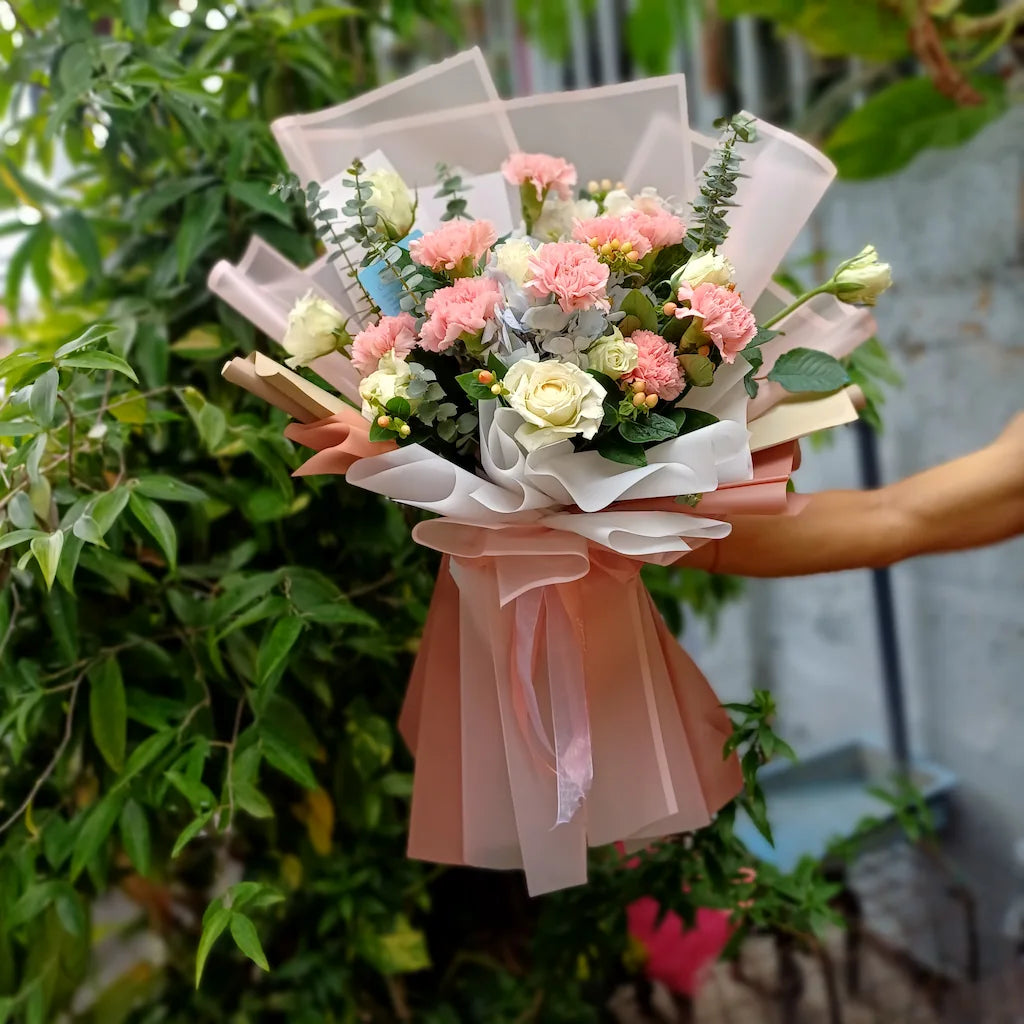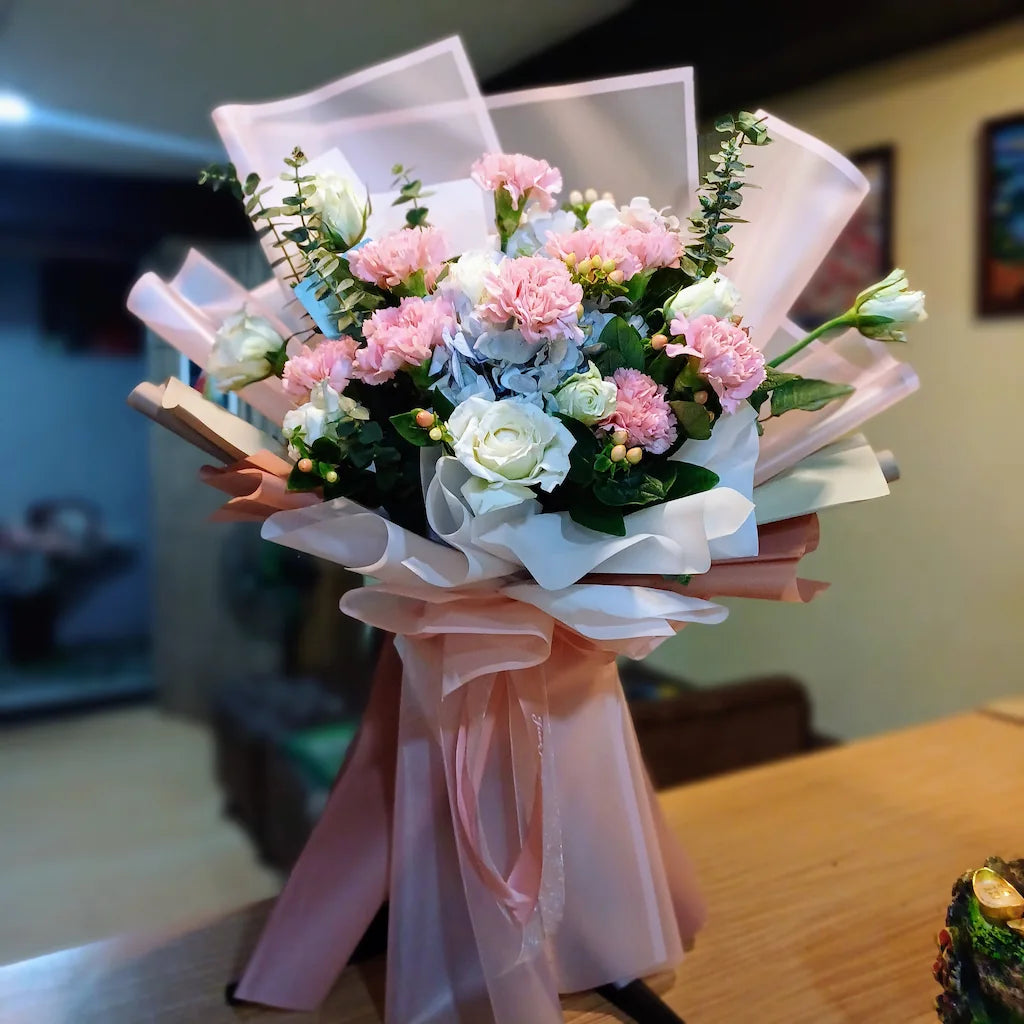 This elegant bouquet combines delicate pink carnations, creamy white roses, and gentle pastel blue hydrangeas, enhanced by fragrant fresh eucalyptus, all artfully arranged. Ideal for marking precious occasions, expressing gratitude, or adding a touch of brightness to someone's day.