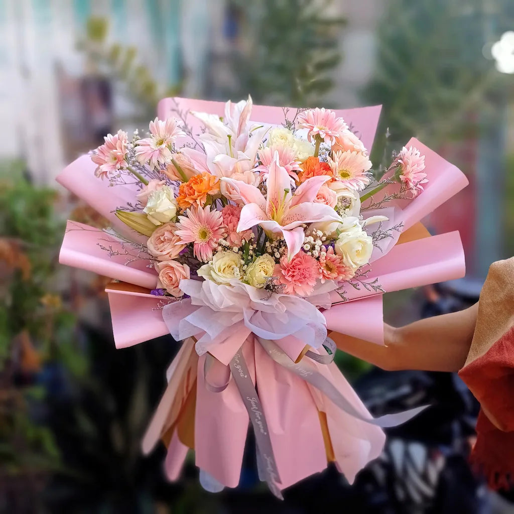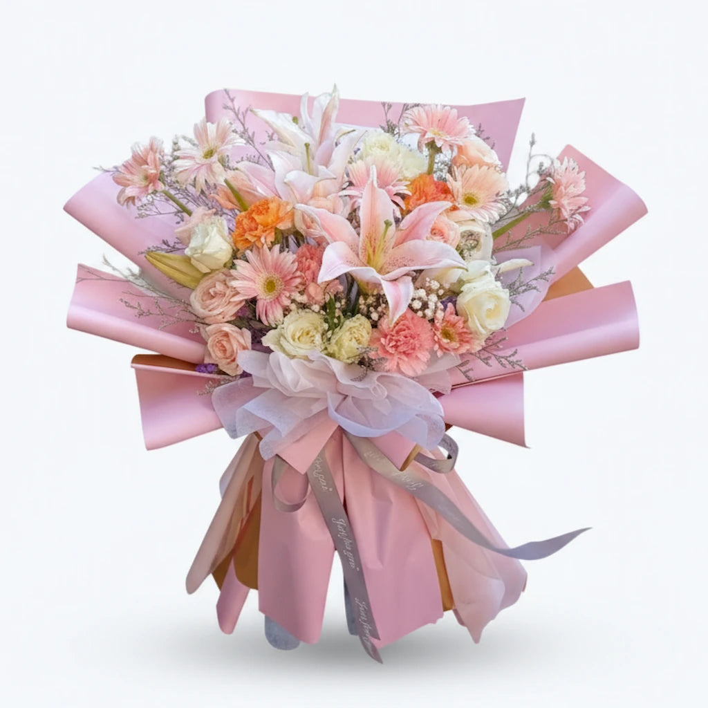 A vision of timeless grace, Enchanté Bloom captures the art of refined romance. Featuring pink lilies, peach carnations, soft gerberas, and ivory roses, this arrangement radiates effortless charm. Wrapped in layers of blush pink paper and satin ribbons, it's a bouquet made to captivate hearts with understated luxury.