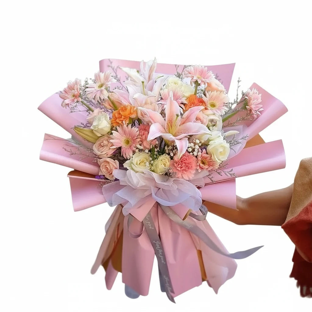 A vision of timeless grace featuring pink lilies, peach carnations, soft gerberas, and ivory roses. The Enchanté Bloom bouquet captures refined romance with 8 pink gerberas, 3 pink stargazer lilies, 6 white roses, 5 pink roses, and carnations, wrapped in layers of blush pink paper and satin ribbons. Perfect for Valentine's Day surprises, anniversary celebrations, romantic gestures for your wife, or thank-you moments—because this arrangement radiates effortless charm and understated luxury.