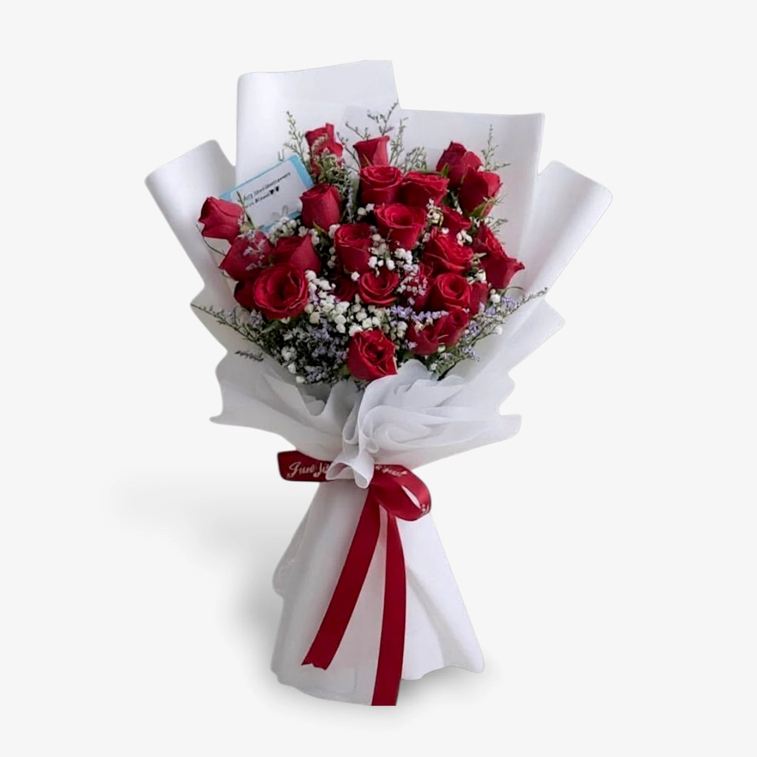 24 Red Roses, 3 bunch Baby's breath, 4 bunch Misty blue fillers