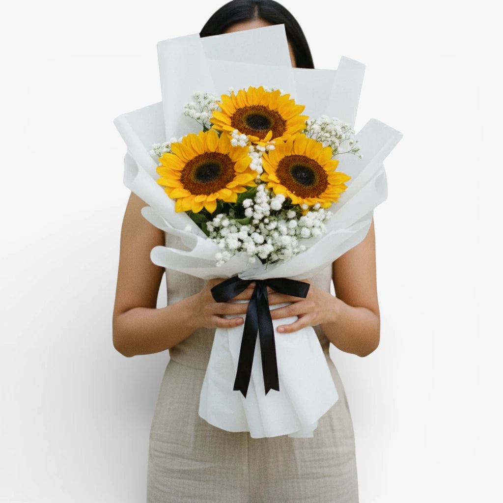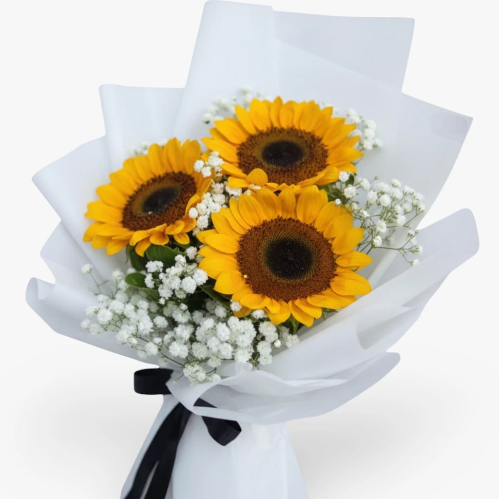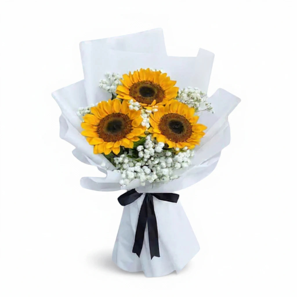 Vibrant sunflowers arranged with complementary blooms with white fillers make this bouquet pure optimism in bloom! Sunflowers symbolize happiness and loyalty, making this perfect for birthday celebrations, get-well wishes, congratulations moments, or simply spreading joy. Elegantly wrapped, this bouquet is ideal for anyone who needs a dose of cheerful energy and warmth. A bouquet that captures nature's way of smiling beautifully!