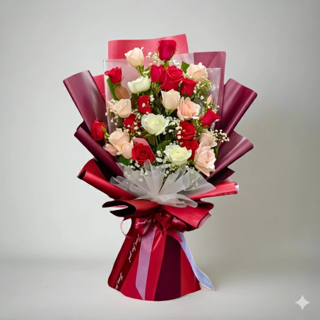 A stunning mix of 24 red, white, and pink roses—elegantly wrapped in deep burgundy tones. A beloved bouquet perfect for celebrating love, affection, and life's most meaningful moments.