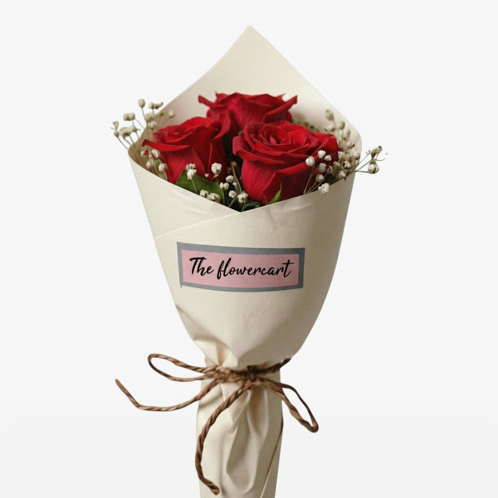 Three premium red roses complemented by delicate baby's breath makes this bouquet enchanting! Red roses symbolize passion and true love, making this perfect for celebrating Valentine's Day, marking special milestones, or simply reminding them they're irreplaceable, because some people are once in a lifetime, and they deserve to know it..