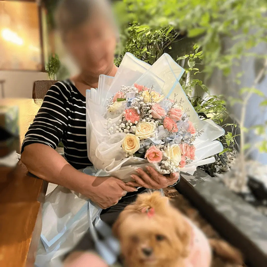 Pastel Blossom boldly mixes hydrangeas, roses, carnations, and baby’s breath in striking shades of blue, pink, and ivory. Wrapped in vibrant blue paper and tied with a matching ribbon, this bouquet makes a fearless statement for unforgettable occasions.