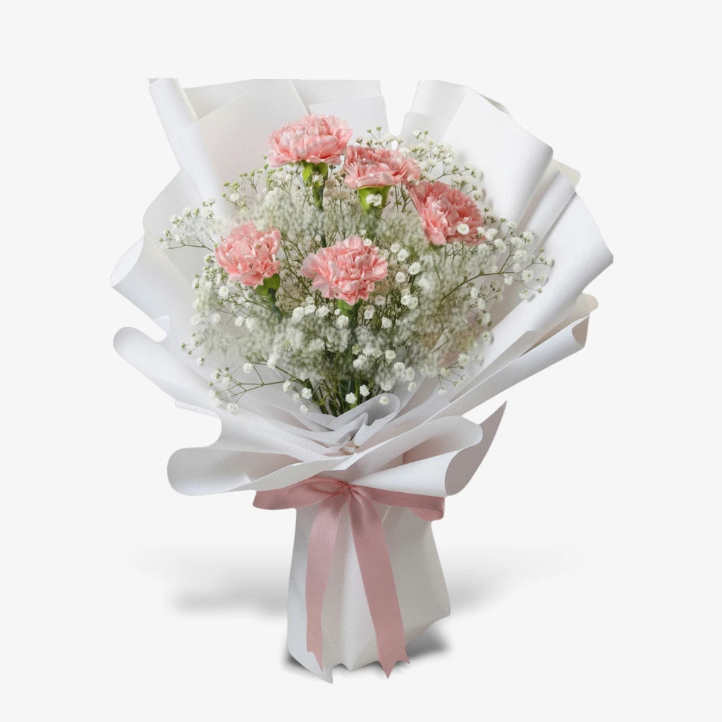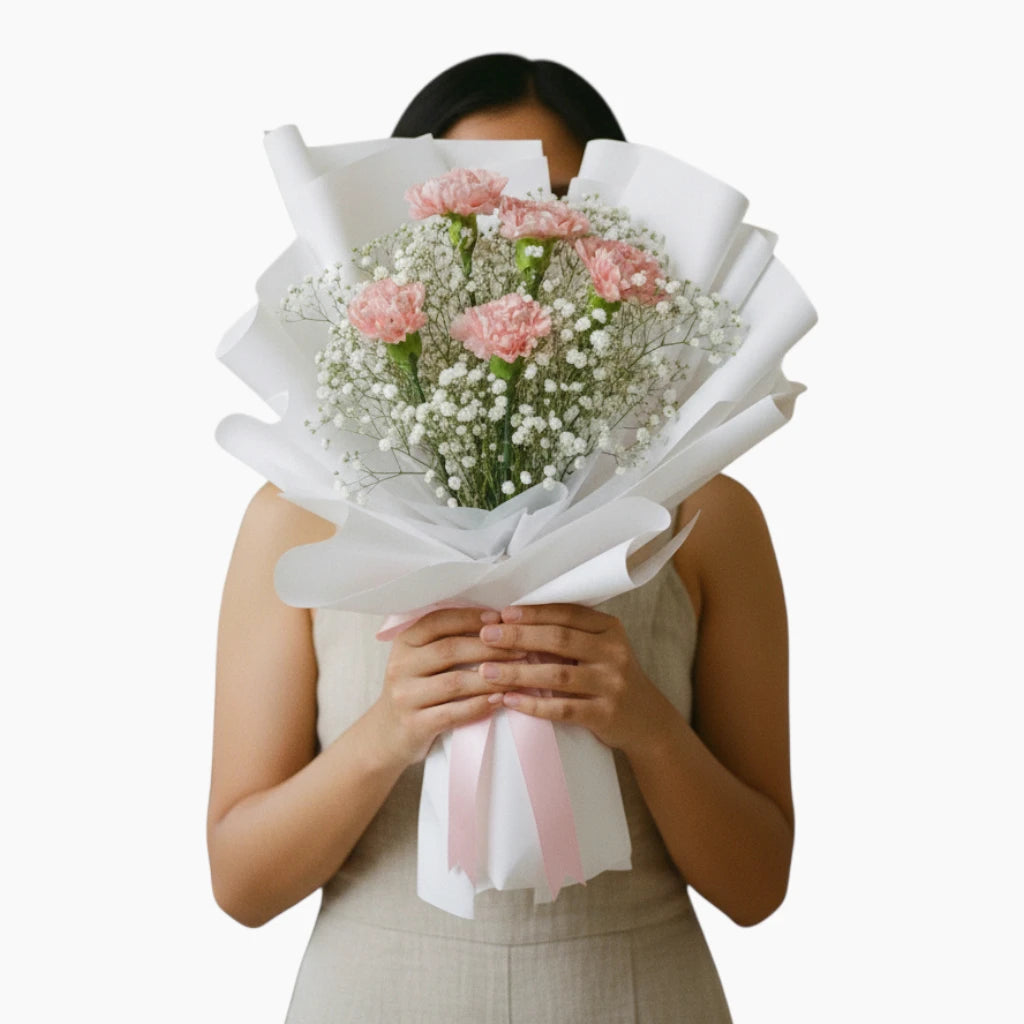 Light pink carnations arranged with delicate baby's breath makes this bouquet breathtaking! Carnations symbolize gratitude, admiration, and tender love, making this perfect for thank-yous, get-well-soon wishes, or heartfelt daily surprises. Elegantly wrapped in minimalist white Korean paper with a soft pink ribbon, this bouquet is ideal for expressing quiet sentiments with grace. A bouquet that speaks softly yet touches deeply!