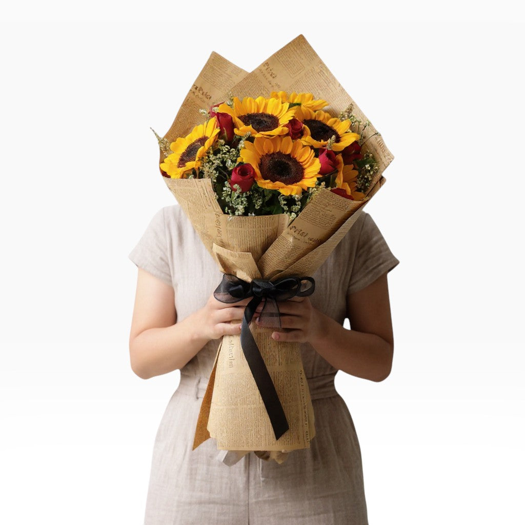 Radiate pure joy with this vibrant celebration of nature's most cheerful flowers. The Sunny Blooms bouquet features 6 golden sunflowers paired with 12 classic red roses and delicate baby's breath, creating a stunning contrast of sunny yellows and passionate reds that's impossible to forget.