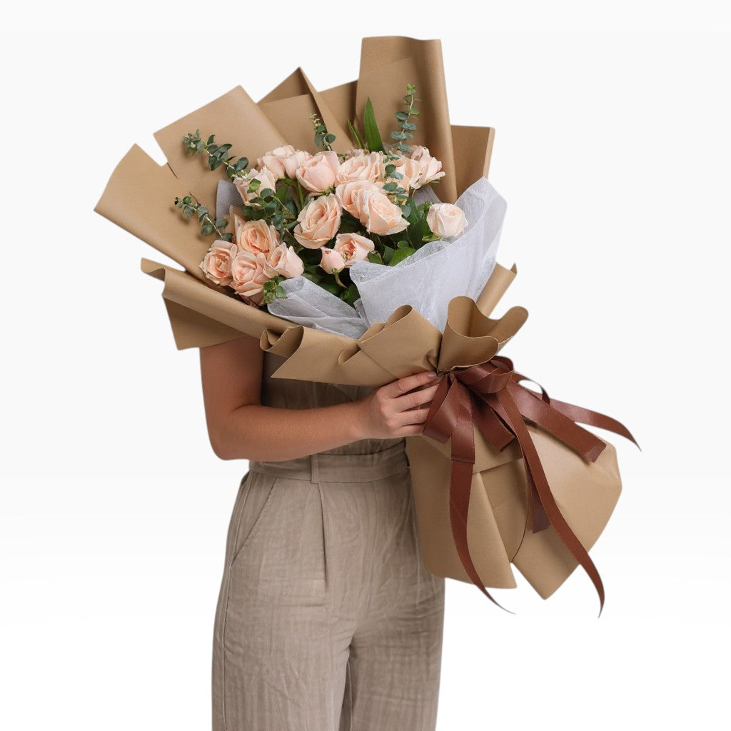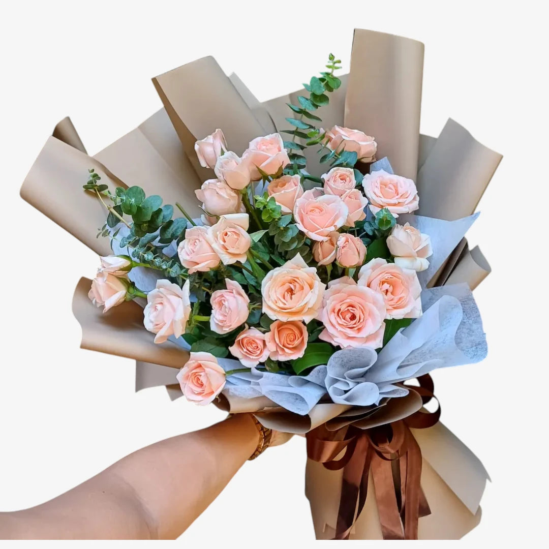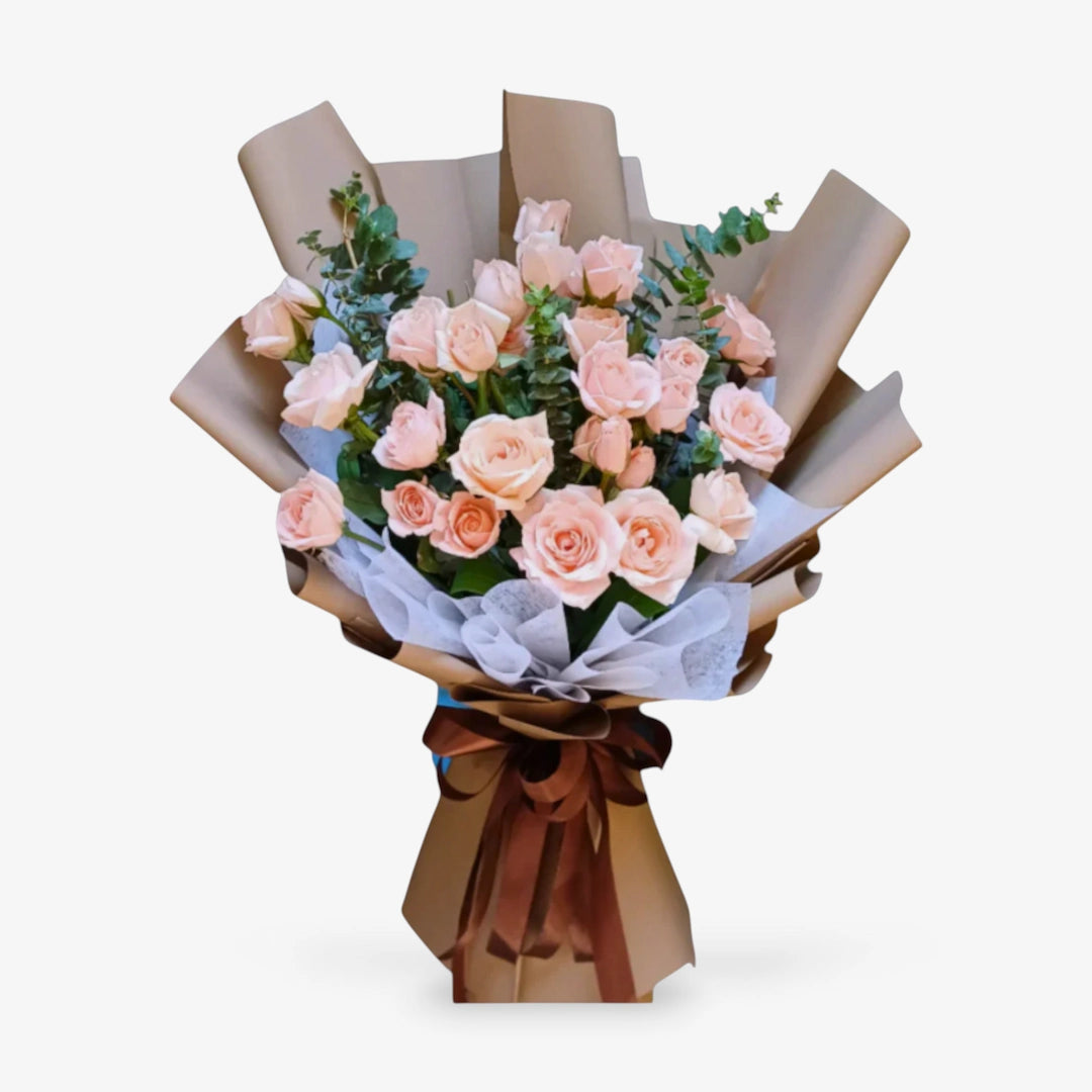 Twenty-four delicate pink roses paired with fresh eucalyptus create a calming, elegant arrangement. The Terra Cotta bouquet delivers gentle beauty with 24 soft pink roses and aromatic eucalyptus that brings a fresh, earthy element to this thoughtful presentation.