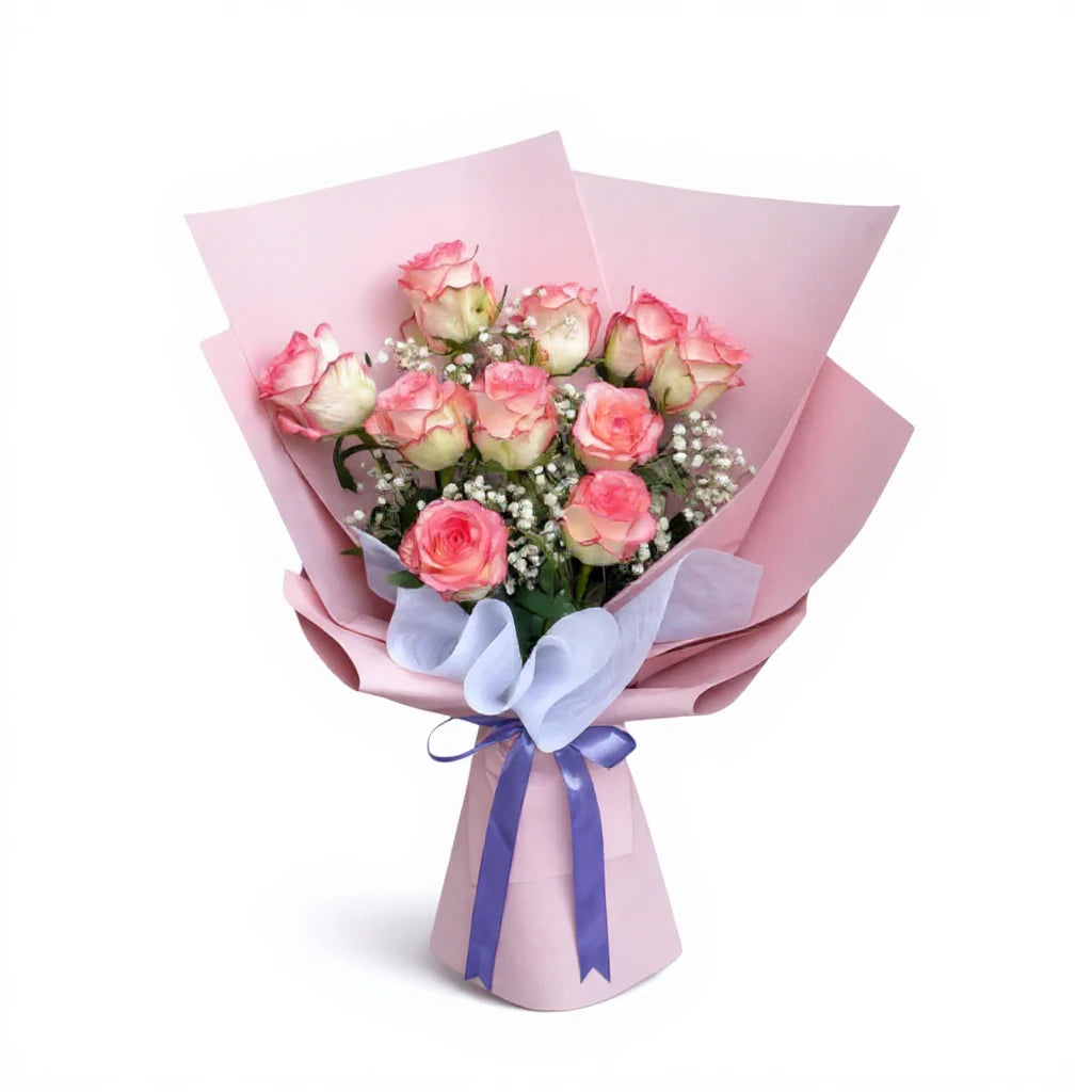 Two-toned light pink China roses arranged with ethereal baby's breath makes this bouquet breathtaking! Roses symbolize admiration and grace, making this perfect for romantic gestures, anniversaries, or celebrating tender moments with loved ones. Elegantly wrapped in luxurious two-toned purple Korean paper with a delicate lavender ribbon, this bouquet is ideal for expressing affectionate beauty and heartfelt devotion. A bouquet that captures blush and whimsy!