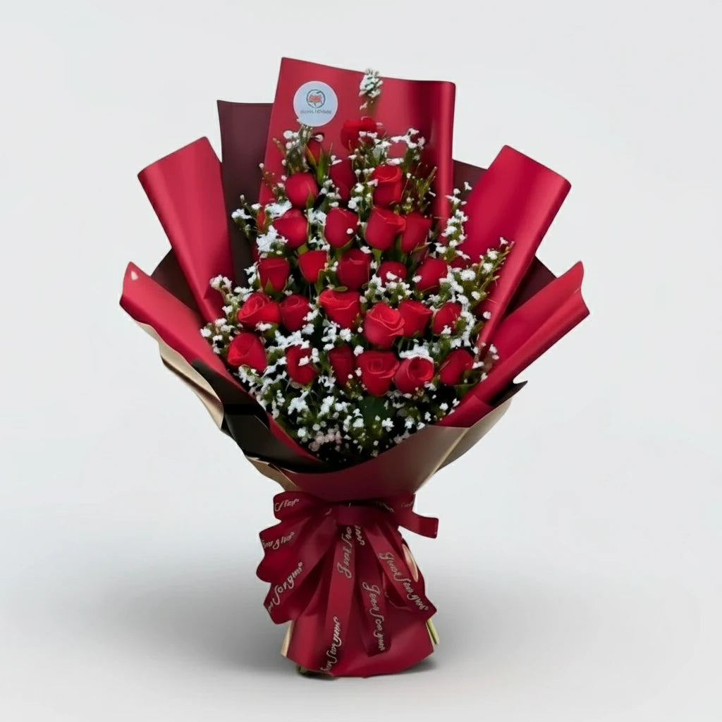 The Valley Scent bouquet combines the striking beauty of two dozen vivid red roses with the delicate charm of baby's breath, creating a classic and elegant arrangement that speaks volumes.