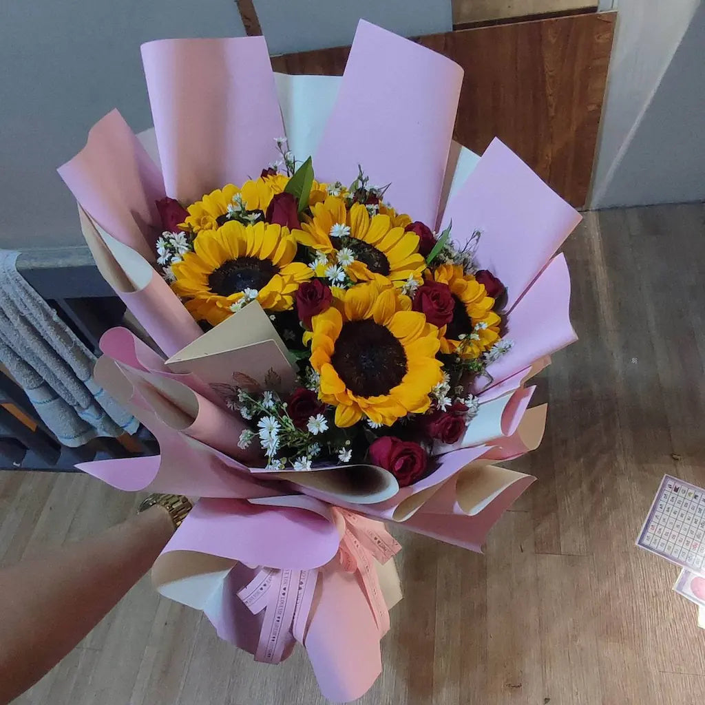 The Velvet Magnolia bouquet combines four sunflowers and a dozen red roses wrapped in pink, offering a graceful and warm floral gift.