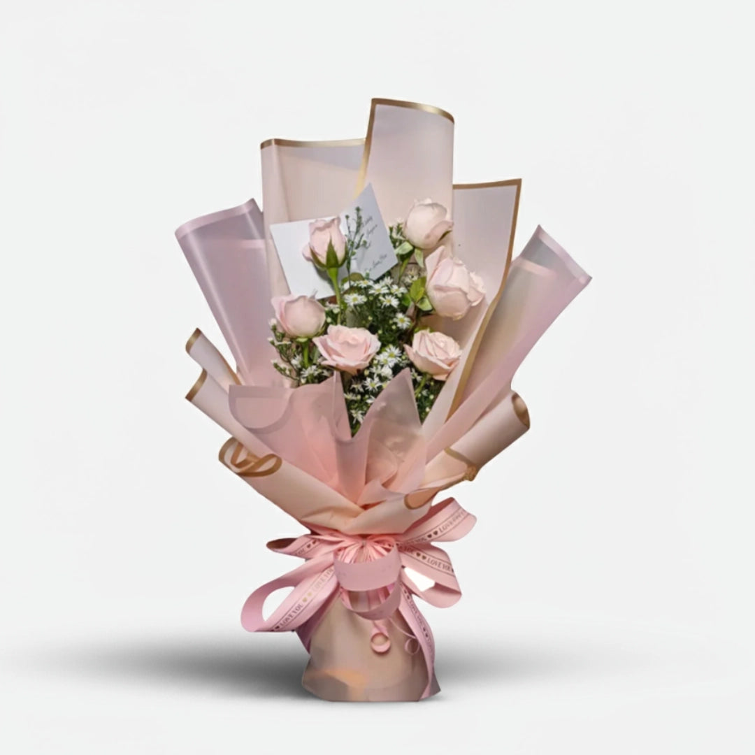The Vivian bouquet features six stunning pink roses, elegantly wrapped to enhance any setting. Perfect for intimate dinners or grand celebrations, this bouquet speaks elegance and charm.