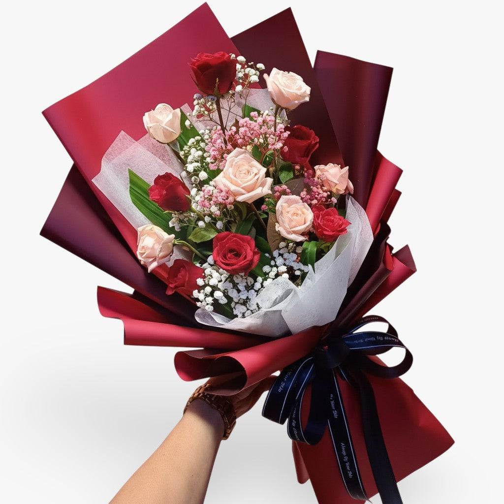 This stunning arrangement features 6 red and 6 pink fresh roses complemented by delicate baby's breath, wrapped in premium paper and tied with a gift ribbon..